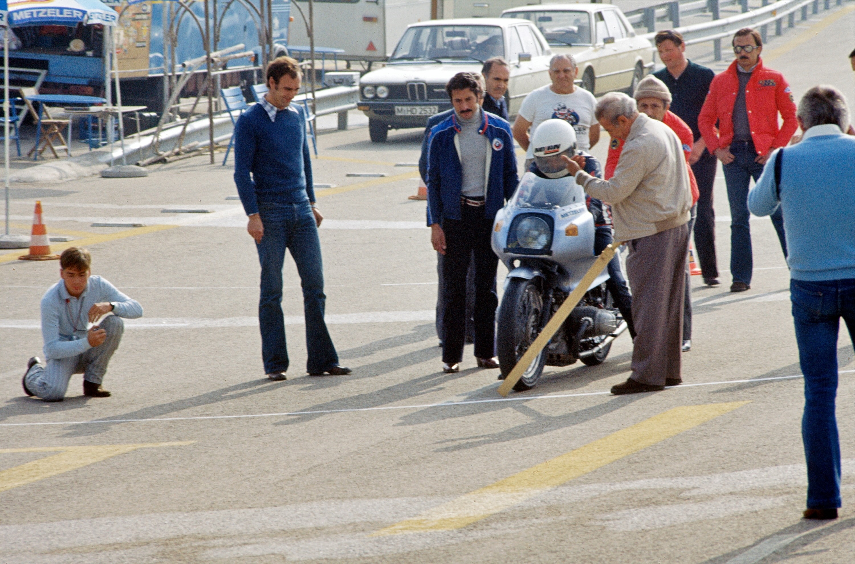 On October 29 and 30, 1977, BMW Motorrad attempted to break several motorcycle world records in Nardò, Italy, using a modified BMW R 100 RS. Record runs were completed over 10, 100, and 1,000 kilometers, as well as 1, 6, 12, and 24 hours. Helmut Dähne, together with engine expert Helmut Bucher, increased the power output of the BMW R 100 RS boxer engine to 84 hp. With a 19‑inch rear wheel and the fairing’s lower section removed, the motorcycle achieved more than 220 km/h. In total, the BMW Motorrad team set five new world records: over 10 km, 100 km, 6 hours, 12 hours, and 24 hours.