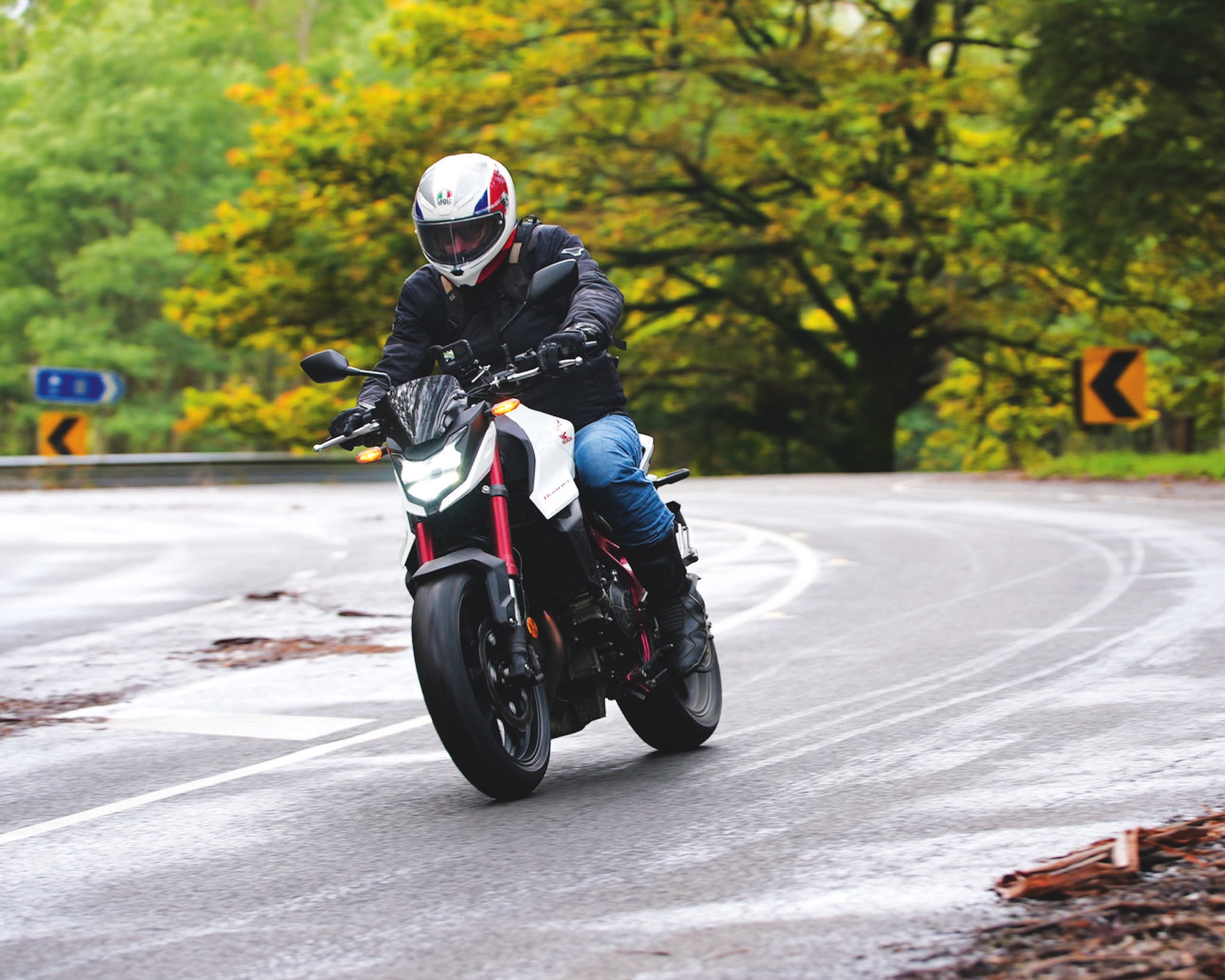 My pace was tempered by the wet road, a result of overnight rain and cold temperatures, and I was enjoying myself far more than usual for a wet ride; a combination of the lightweight Honda CB750 Hornet, brand-new tyres and the glorious midrange of the new machine combined to make riding the ranges east of Melbourne great fun, even in wet weather gear.