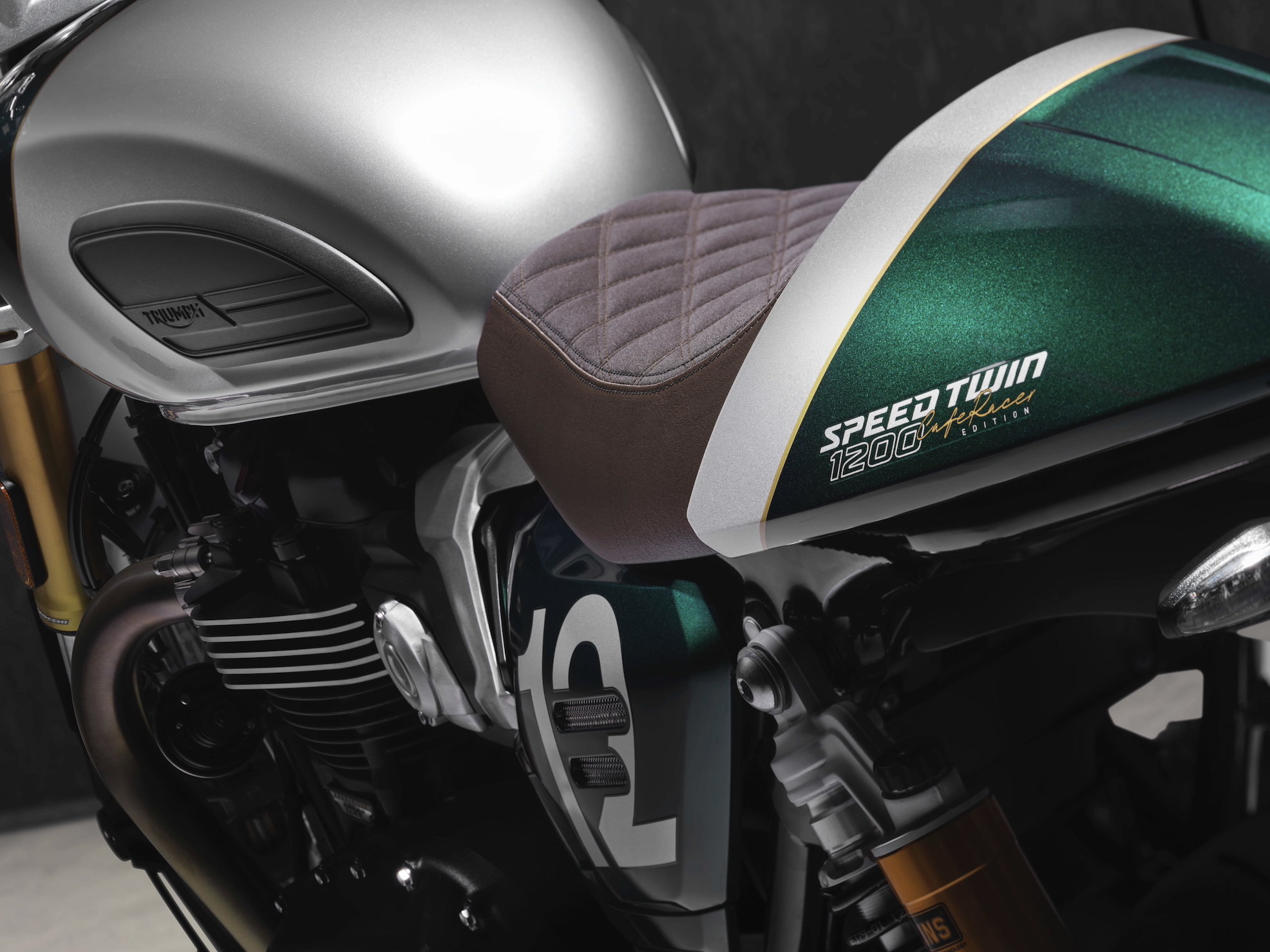 An Empire Gold coachline defines the transition between colours, while the “Cafe Racer Edition” graphic in Empire Gold completes the tank. The two-tone theme continues across the seat cowl and side panels, which feature a Number 12 graphic in Aluminium Silver.