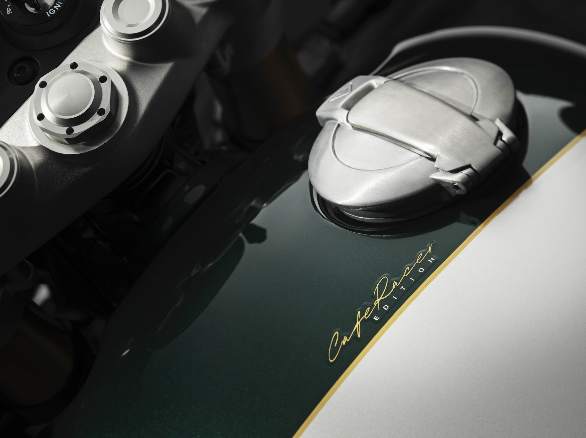 The Cafe Racer Edition features a low, tucked riding position created by the clip-on handlebars and streamlined single-seat profile. Machined ’bar-end mirrors reinforce the clean silhouette, while ribbed clutch and alternator cover badges, black head bolt covers and sculpted knee pads add subtle detailing.